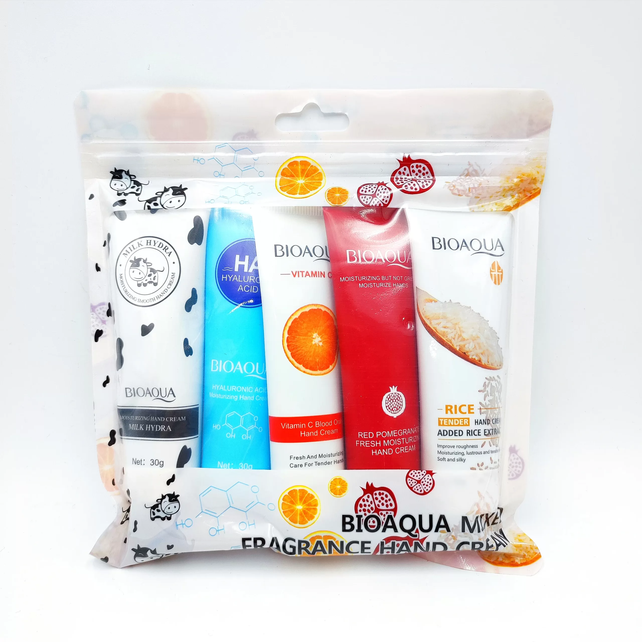 این پک شامل پنج کرم مرطوب کننده و مغذی دست می باشد .که حاوی عصاره های گیاهی و عصاره پرتقال شیر گاو هیالورونیک اسید انار و برنج هستند که هرکدام خاص فوق العاده ای برای پوست دارند.