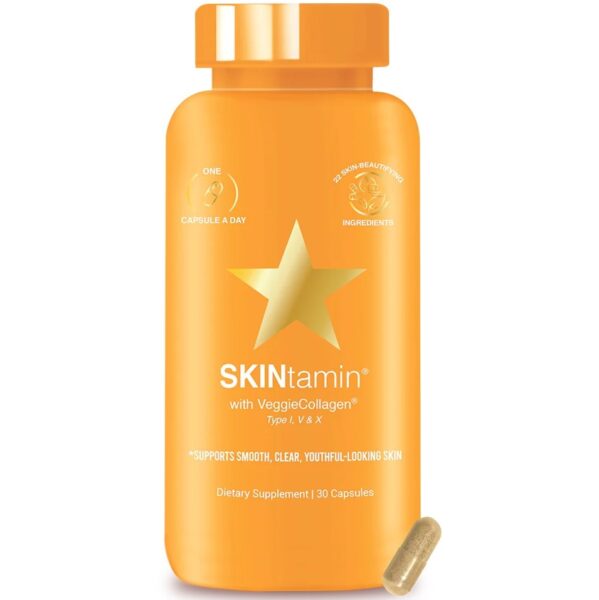 حاوی 22 ماده موثر باکیفیت با منشاء طبیعی و ویتامین های ضروری برای حمایت از سلامت پوست از درون می باشد. مکمل اسکین تامین حاوی کلاژن بدست آمده از غشای پوسته تخم مرغ برای افزایش شکل گیری و تولید کلاژن به عنوان عامل اتصال بافت پوست برای ایجاد مش مستحکم تر، کاهش چروک ها و افزایش سفتی و انعطاف پذیری پوست می باشد. اسکین تامین همچنین کاهش دهنده جوش است و به بهبود رنگ پوست و افزایش روشنایی پوست کمک می کند. علاوه بر این هیالورونیک اسید برای آبرسانی پوست، نیاسین آمید برای کاهش لک، جوش و بهبود رنگ پوست و پنتنول (ویتامین B5) برای ترمیم و بازسازی پوست به این ترکیب اضافه شده است.